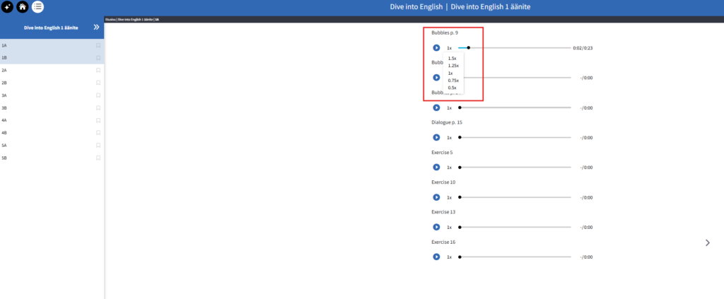 Jos olet hankkinut oppikirjaa tukevan suoratoistoäänitteen (ONL-äänite), voit nyt säätää sen äänennopeutta joko hitaammaksi tai nopeammaksi. Nopeudensäädin löytyy Play-painikkeen vierestä oikealta puolelta.
